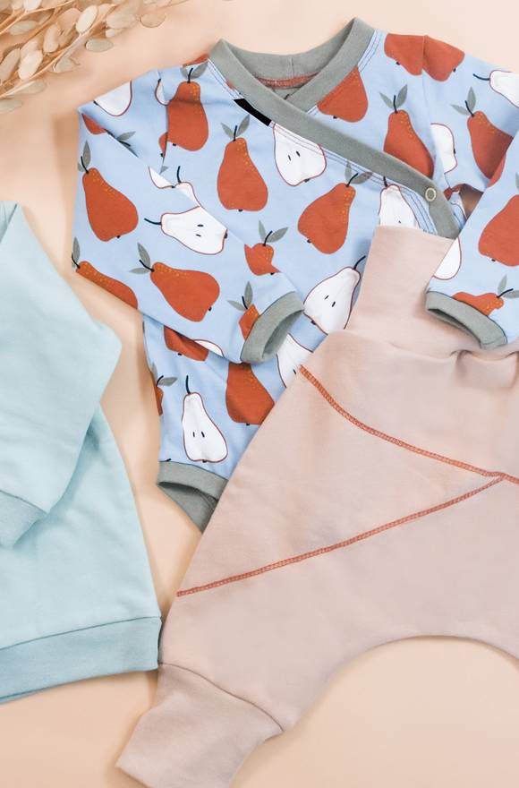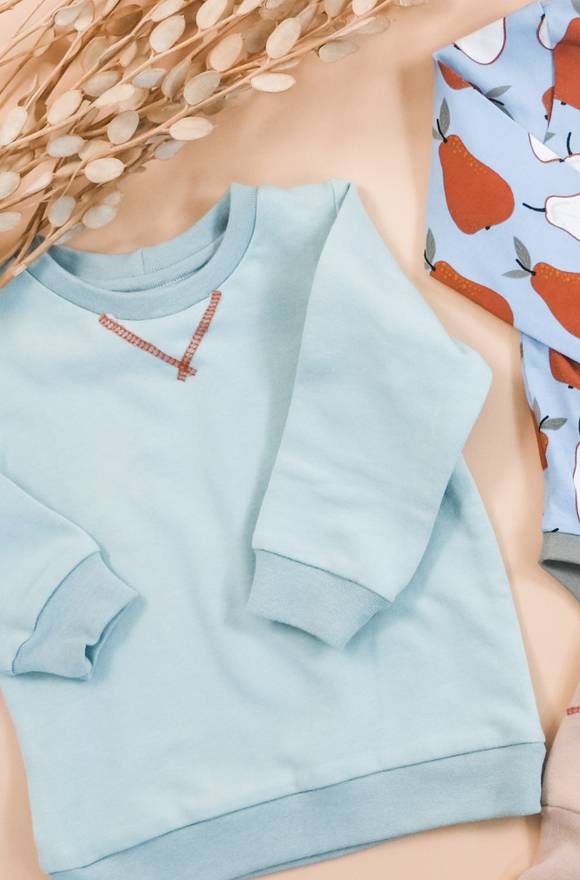 Das Sweatshirt hat das typische Dreieck vorne unterm Halsausschnitt bekommen. Die Pumphose hat die typischen Lybstes-Unterteilungen als Ziernaht bekommen und der Body wurde nochmal klassisch mit einer Doppelnaht neben dem Bündchen entlang abgesteppt.