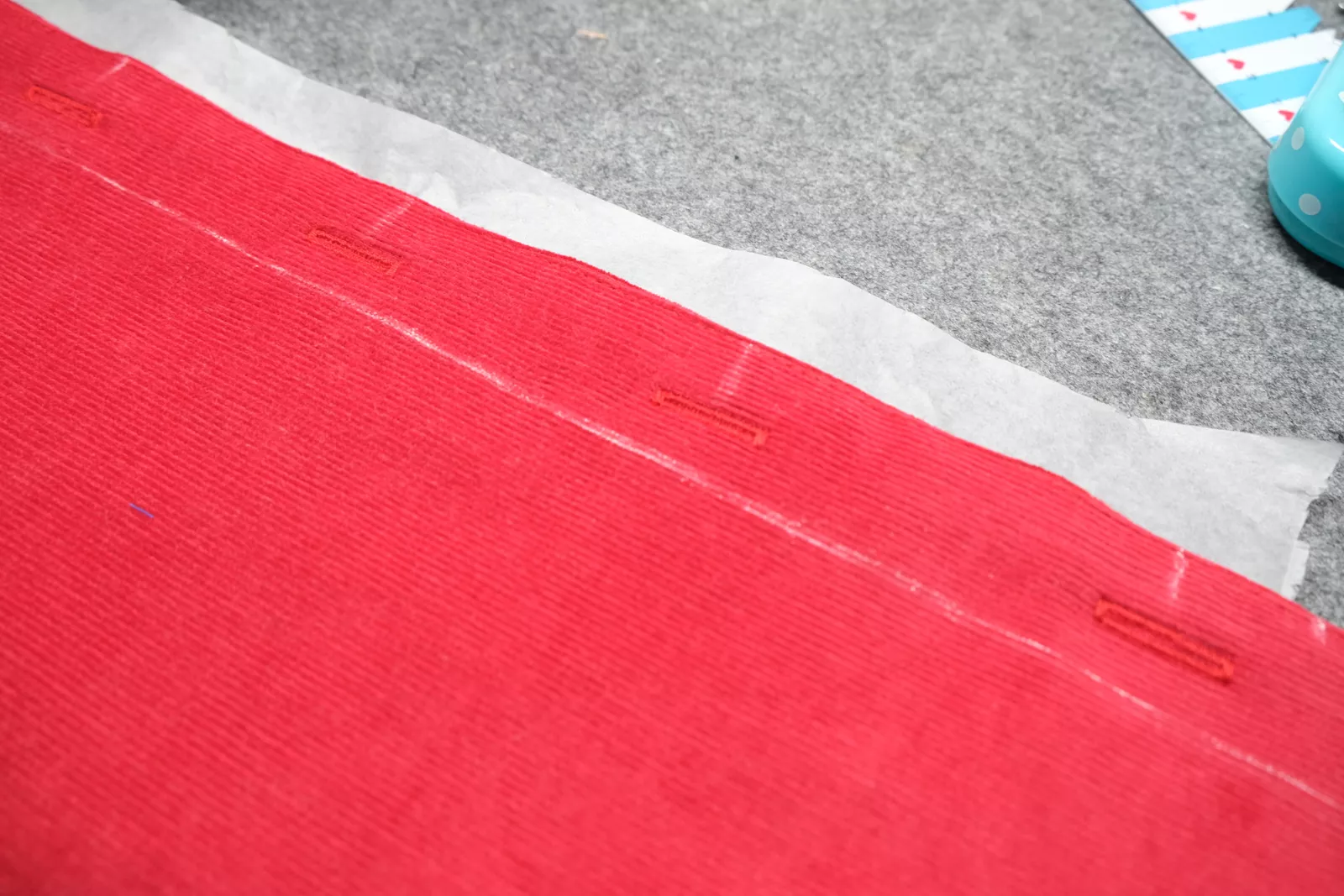 Und dann heißt es: Die Nähmaschine ihre Arbeit machen lassen! Sie kann nun ganz genau berechnen, wie die ideale Größe des Knopfloches ist und setzt die Löcher selbstständig. Beim ersten Mal führt man den Stoff automatisch etwas mit, aber man merkt ganz schnell, dass sie den Stoff ganz alleine gleichmäßig führt.