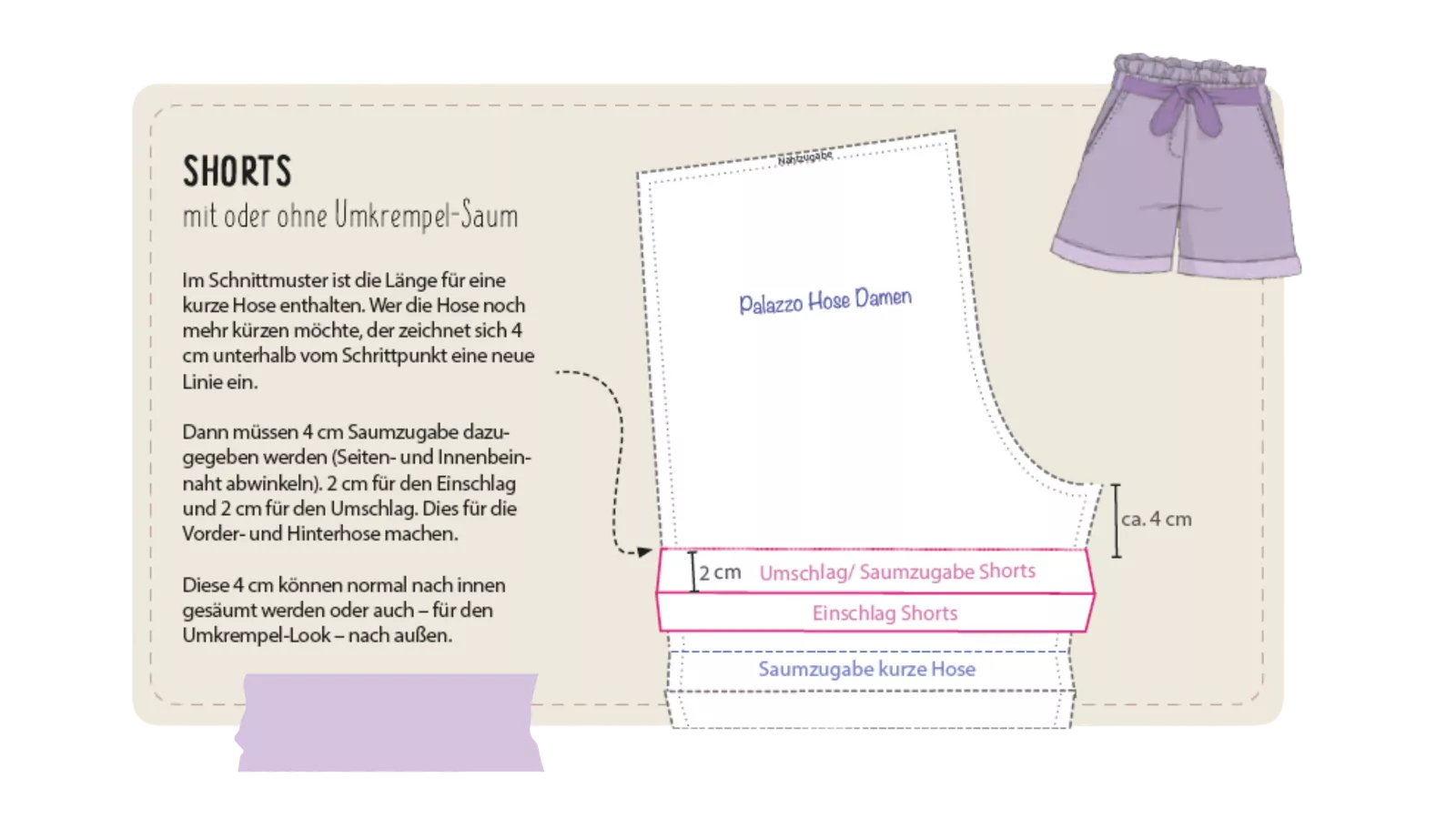 Bei Anpassungen an Hosen ist es ähnlich wie bei Oberteilen oder Kleider. Man passt die Länge nicht unten am Hosensaum an, sondern unterhalb des Knies. Hier sind zwei Beispiele, wie man eine Hose auf unterschiedliche Längen bringt oder sogar zu einer Shorts macht.