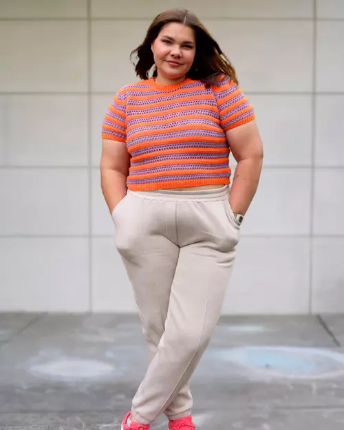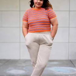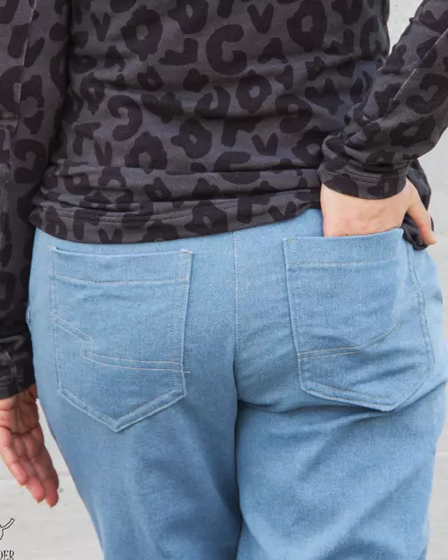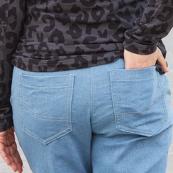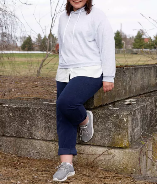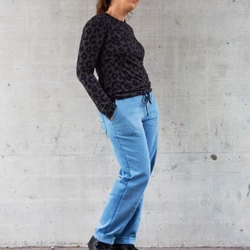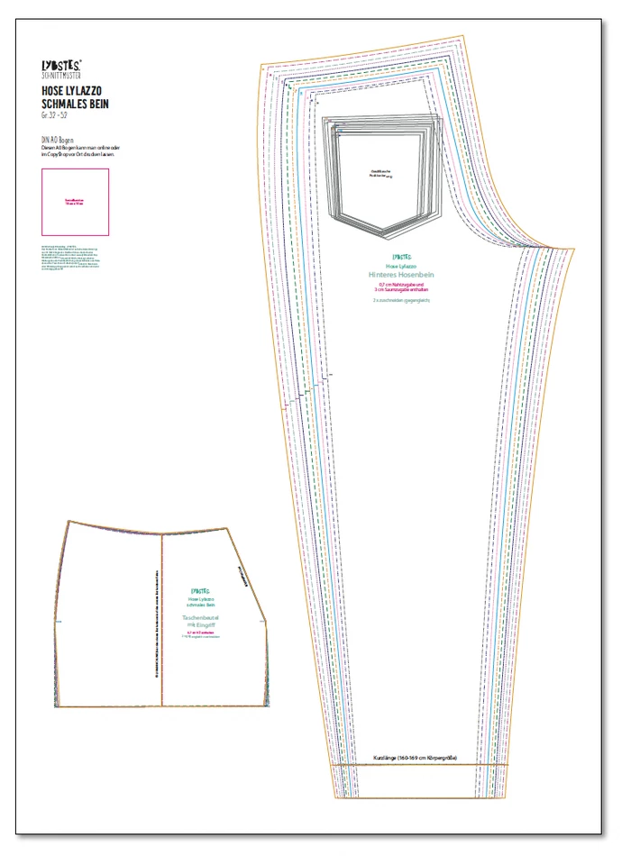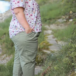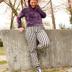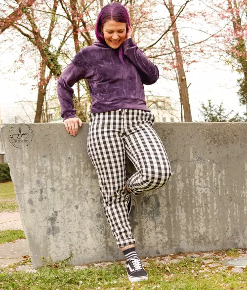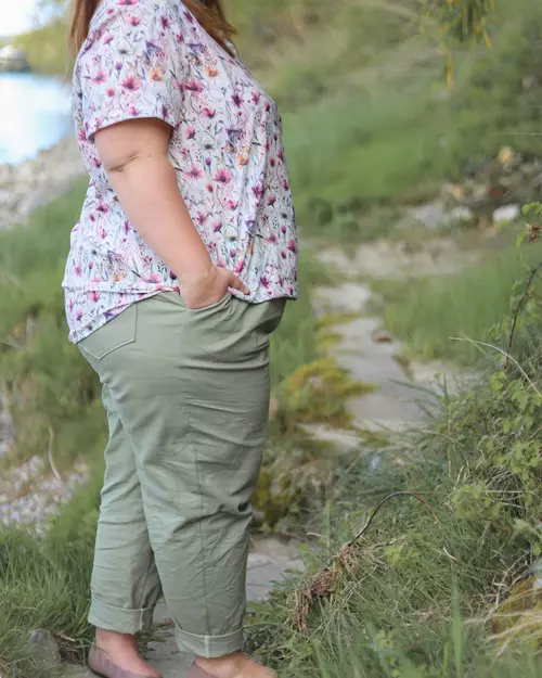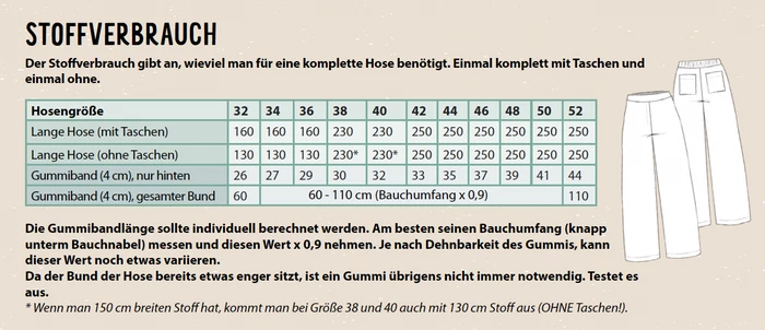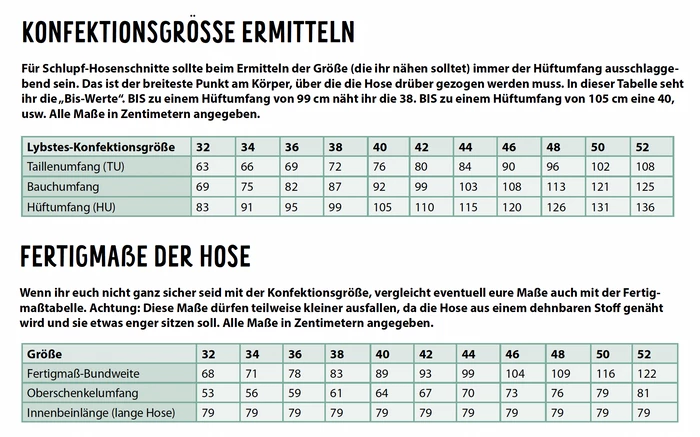 👉 Wichtig: Da die Hose oben körpernah sitzt, solltest du unbedingt einen ausreichend dehnbaren Stoff wählen, damit sie bequem sitzt und jede Bewegung mitmacht. Vergleiche vor dem Nähen am besten sorgfältig deine Körpermaße mit der Maßtabelle und wirf zusätzlich einen Blick in die Fertigmaßtabelle. So findest du die passende Größe für dich.