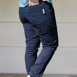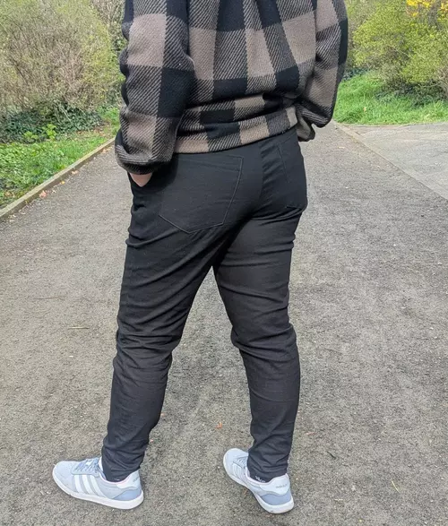 Die Hose sitzt im Bund- und Hüftbereich körpernah und hat ein schmales Bein, sodass ein moderner, sportlicher Look entsteht.