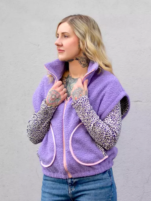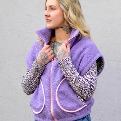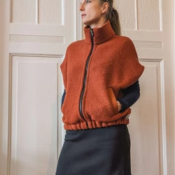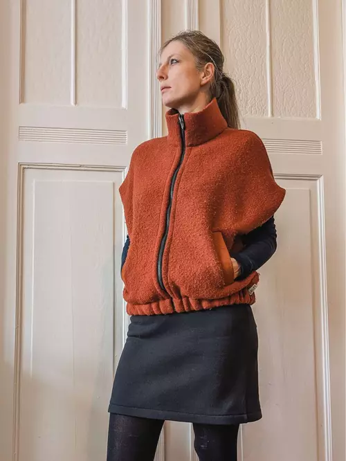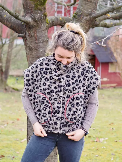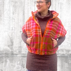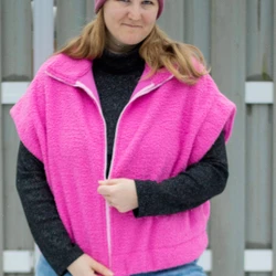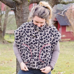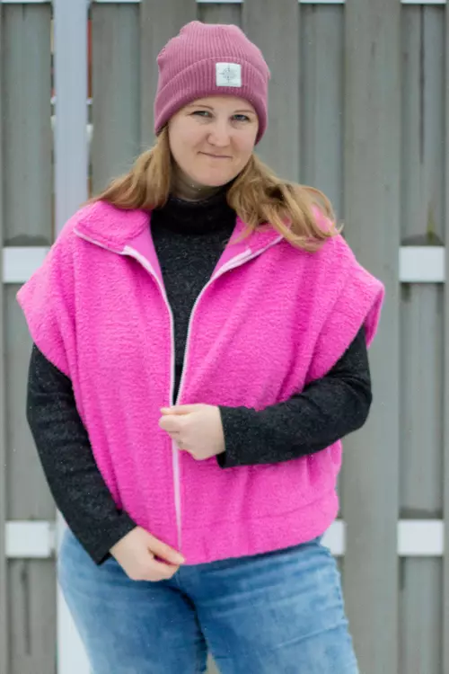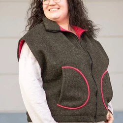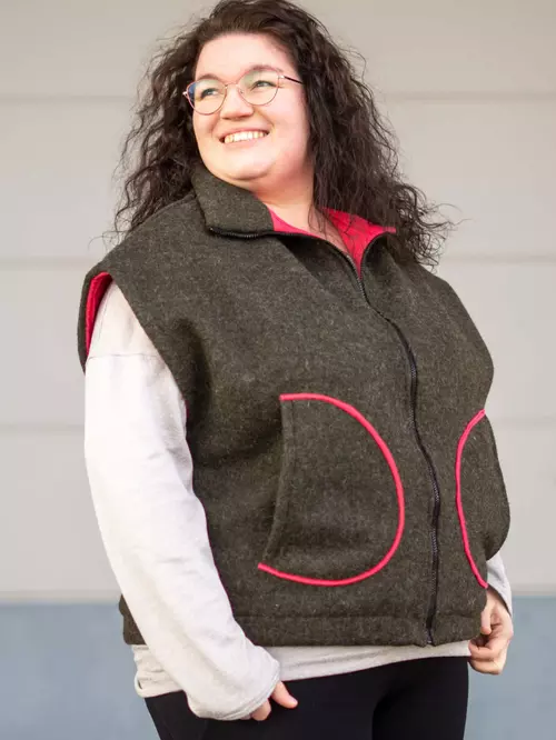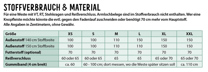 Die Weste kann gefüttert oder ungefüttert, mit Knopfleiste oder Reißverschluss genäht werden. Für NähanfängerInnen sind zwei aufgesetzte Taschen dabei, für geübtere NäherInnen auch die Leistentasche.