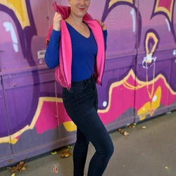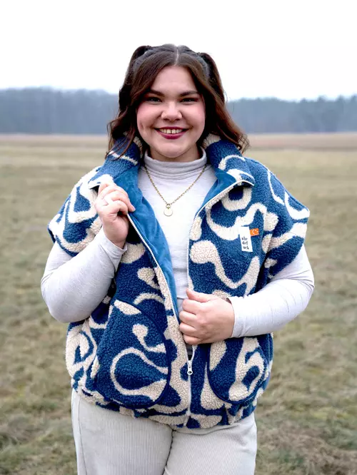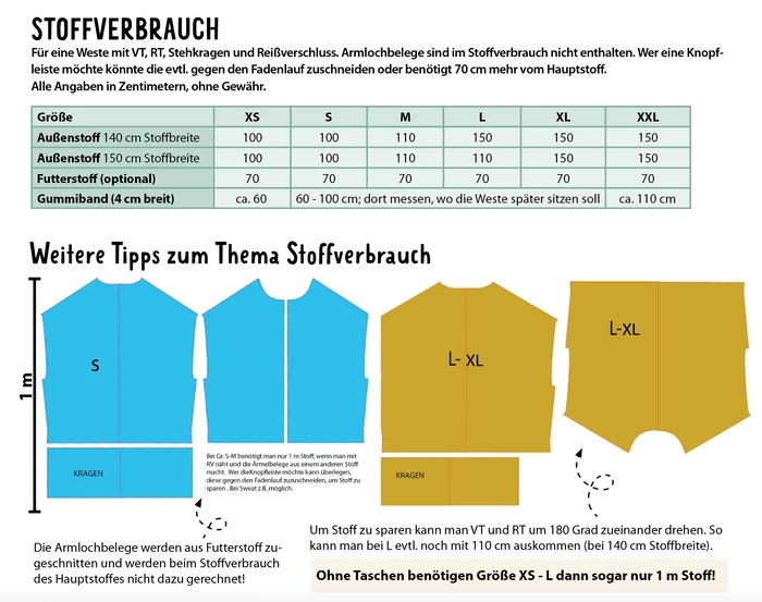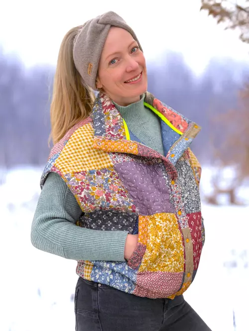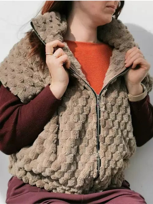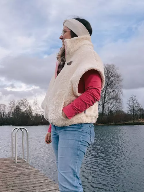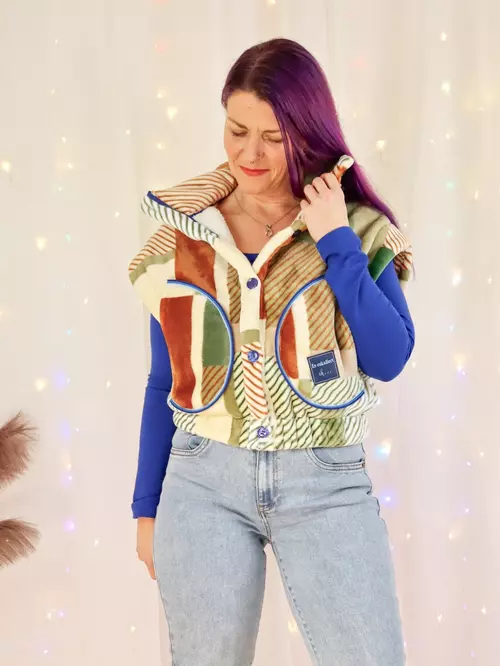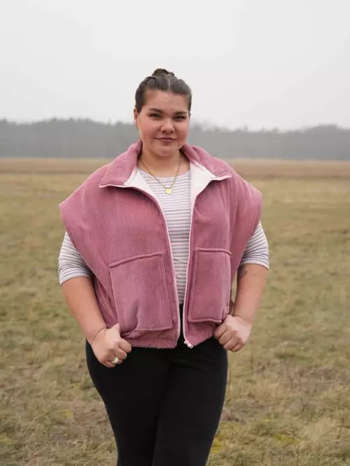 Die Weste ist für feste Stoffe gedacht, egal ob dehnbar oder nicht. Teddy, Steppstoffe und Kord, aber auch Jeans oder Heavy-Sweat sind geeignet. Gefüttert werden kann sie mit extra Futterstoffen, aber auch leichtem Tencel, Viskose oder Teddy. Mehr Infos zum Materialmix gibt's im E-Book.