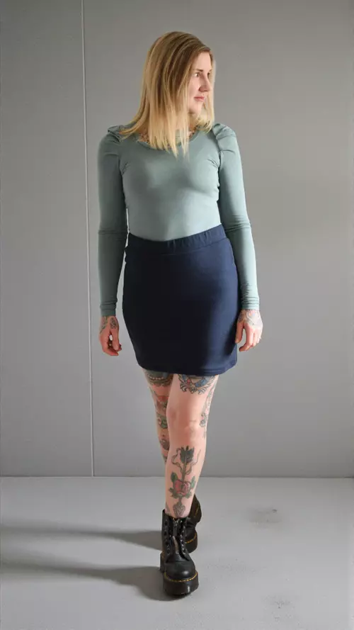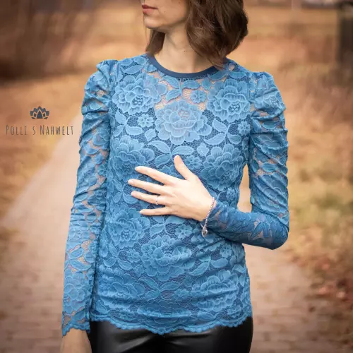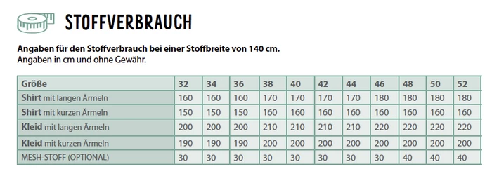 Das Shirt ist eng geschnitten und für dehnbare Jerseystoffe ausgelegt. Ribjersey und Viskosejersey sind besonders angenehm. Für den Mesh-Einsatz benötigt man Meshjersey.