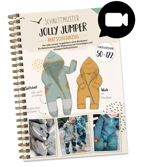 Der "Jolly Jumper Matscheanzug" ist ideal für Softshell oder andere wasserabweisende Stoffe. Auch aus Walk wird er gerne genäht. Er wird nicht gefüttert, hat dafür aber coole Knie- und Popatches zur Verstärkung. Ärmel und Beine haben einen Gummizug und können außerdem mit verdeckten Bündchen genäht werden (oder mit Umschlägen).
