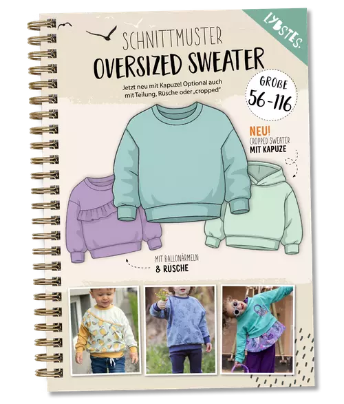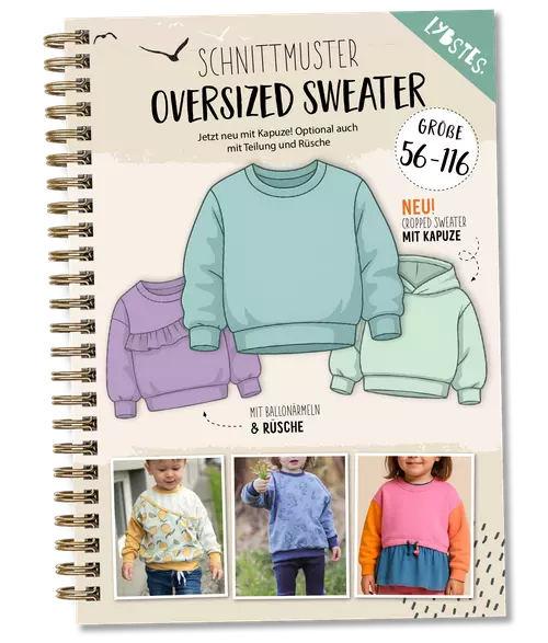 Der Oversized Sweater für die Kinder ist locker geschnitten und für Jungs, genauso wie für Mädchen gedacht! Er kann ganz schlicht genäht werden, mit normalen Ärmeln. Oder mit Unterteilungen, Rüschen und Ballonärmeln. Alle Schnitteile und Anleitungen sind in diesem E-Book enthalten!