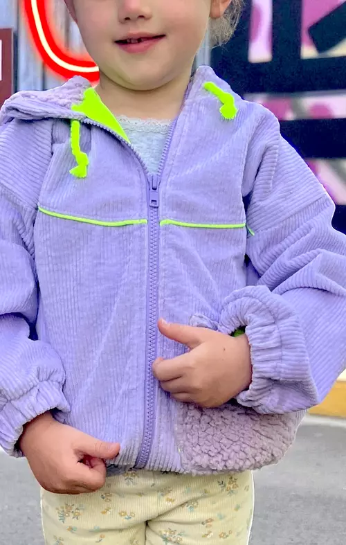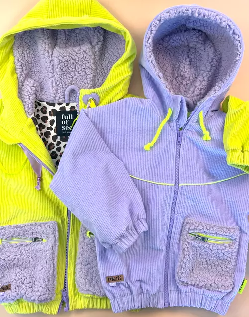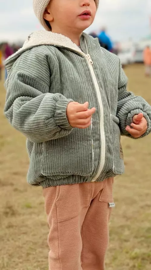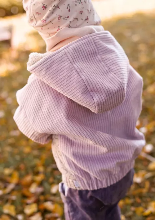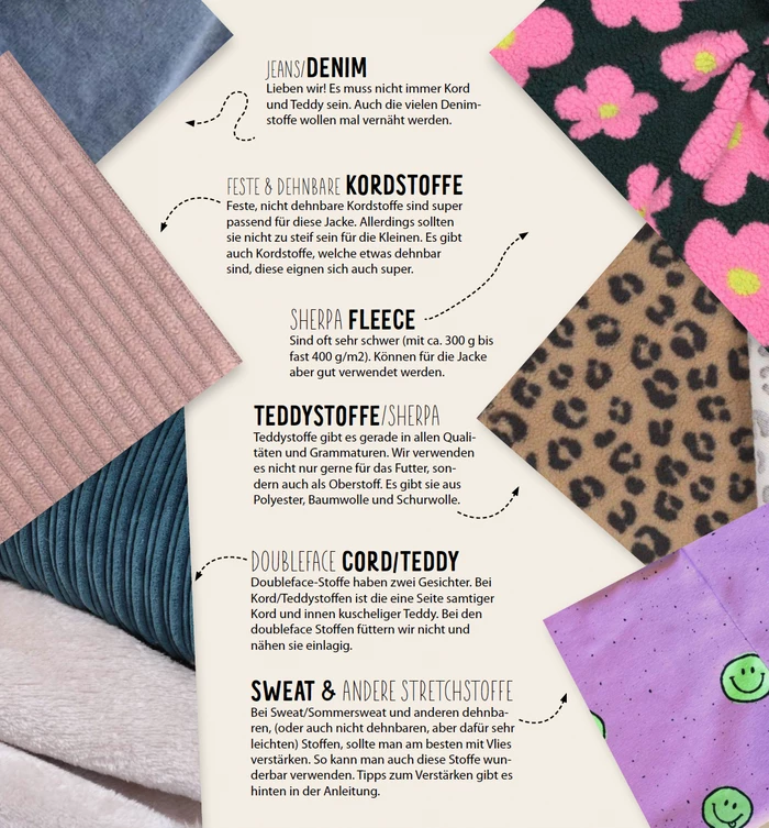 Außen Kord und innen Teddystoff ist gerade unsere Lieblingskombi! Aber auch alle anderen Stoffe sind denkbar. Jeans, Flanell, Fleece... nur, wenn Sweat oder ähnlich dehnbare Stoffe gewählt werden, muss man mit Vlies verstärken. Die doubleface Kord/Teddystoffe können auch vernäht werden - dafür haben wir die Anleitung für die ungefütterte Jacke mit reingenommen.
